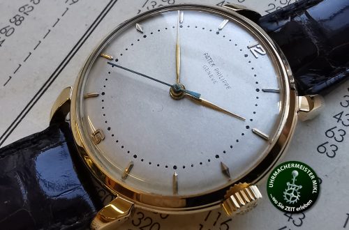 Dieser außergewöhnliche und sehr schöne Chronograph aus den 1940er Jahren hat ein sehr seltenes Landeron Kaliber 39 verbaut. Im Gegensatz zu typischen Landeron Chronographen (48, 248…) ist dieses Kaliber mit einem Schaltrad ausgestattet und sehr selten. Und weil die Restauration von mechanischen Uhren immer ein Abenteuer ist, war genau bei diesem Werk der Zapfen vom Chrono-Sekundenrad weg. Von den häufigen Schwesterkalibern passte das Teil natürlich nicht und sonst hatte ich in meinem Lager auch nichts. Dank unserer internationalen Vernetzung konnte ich das begehrte Bauteil aber bei einem befreundeten italienischen Furnituristen auftreiben und die Uhr retten. Wir sind Uhrmacher aus Leidenschaft!